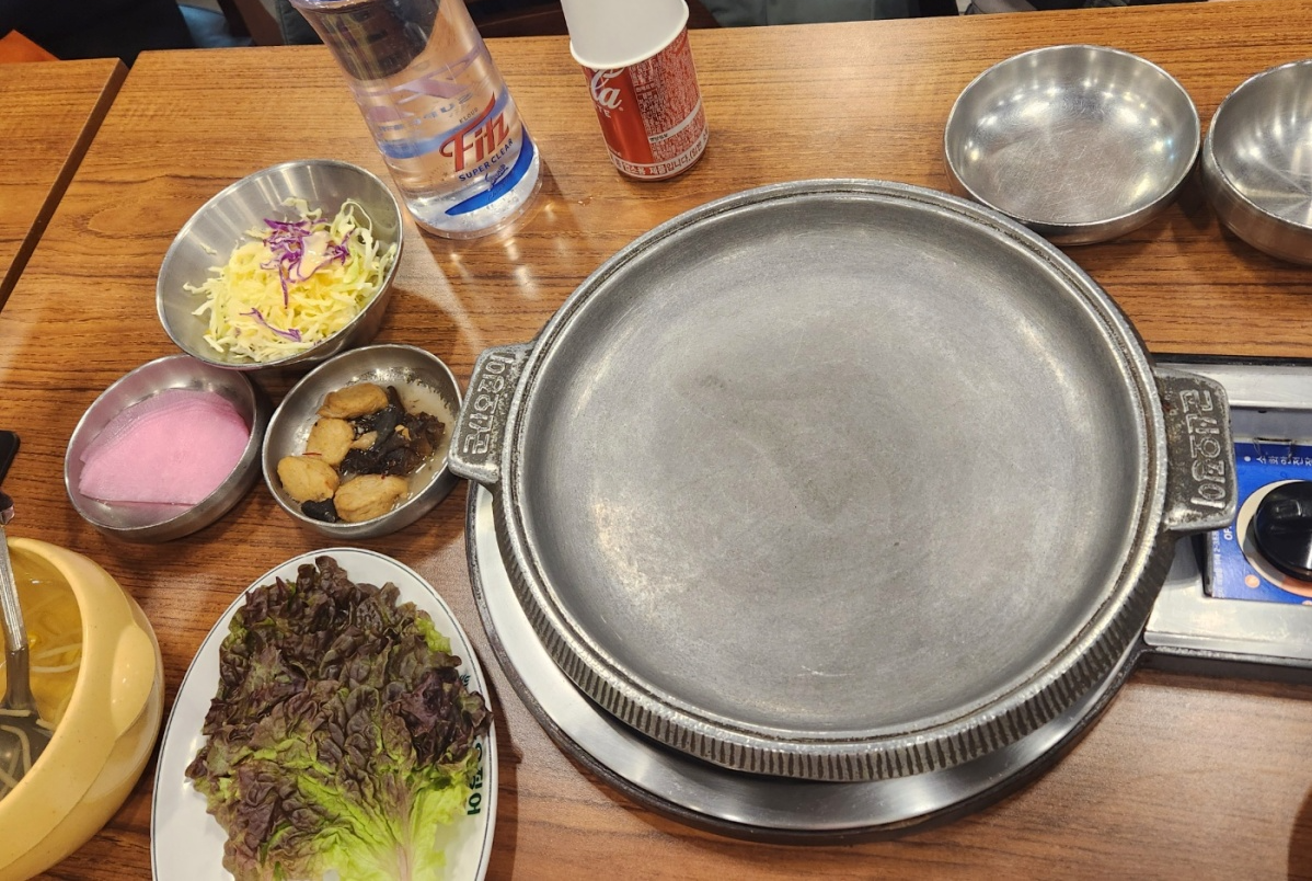 열심히 시잔을 찍었음. 중간 중간 종업원분께서 오셔서 뒤집어 주시면서 어느정도 익었는지 체크해 주심. 기본 반찬에 있는 콩나물을 같이 넣어서 볶는걸로. 다 되었다는 말에.. 사실 아직 다 안익은것 같은데.. 란 생각이 들었는데. 먹으니..