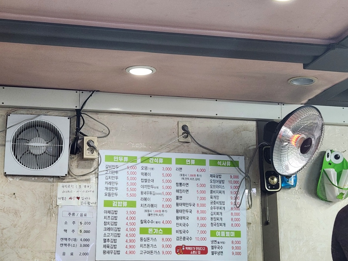 거의 모든 분식류를 취급하고 계심. 있어보니, 만두도 많이 드시고, 김밥류, 간식류 면류를 많이 드시는것 같음. 직접 오셔서 김밥 순대, 떡볶이도 많이 포장해서 가심. 앞에 외관사진보면 옥수수도 있는데, 그 옥수수도 내가 왔을때 마다 많이 사가시는걸 보았음.