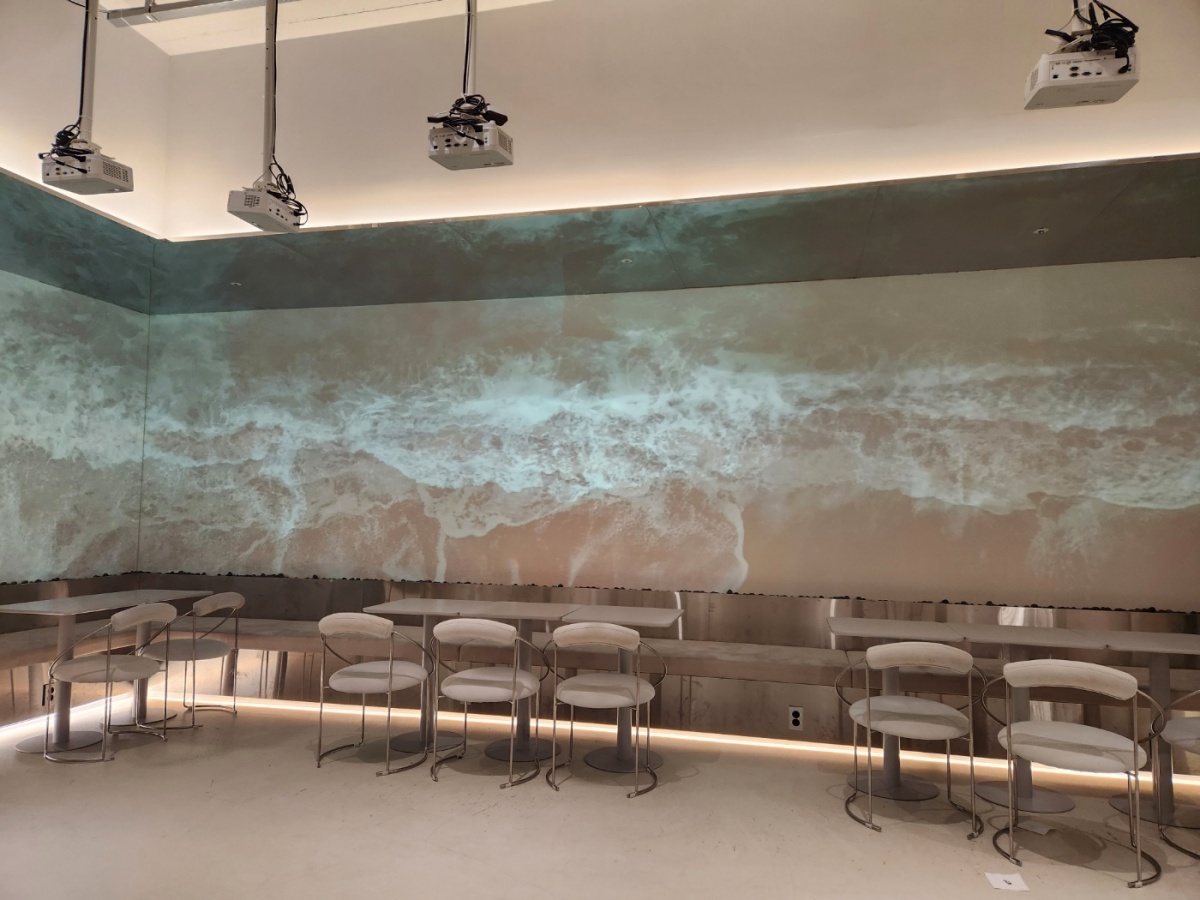 세련된 인테리어를 따라오지 못하는 정리정돈.. 뭔가 제대로 관리가 되지 못하고 있는 이 느낌은 모지...?? 막 더럽다 그런 느낌이 있는것도 아닌데. 뭔가 제대로 관리가 되지 않는 듯한 느낌을 받았고.. 화면에 파도가 치고 있지만 그래도 크리스마스 트리가 이 카페 안에도 있었는데..
