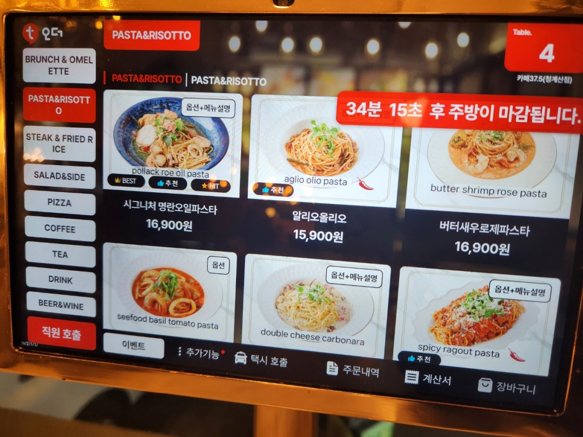 실내는 깔끔하고 우아하게 인테리어 되어 있었고.. 우리가 마지막 손님인듯..  키오스트에 몇분 후에 주방이 마감된다는 문구는 좀 압박이 되긴 하였다.