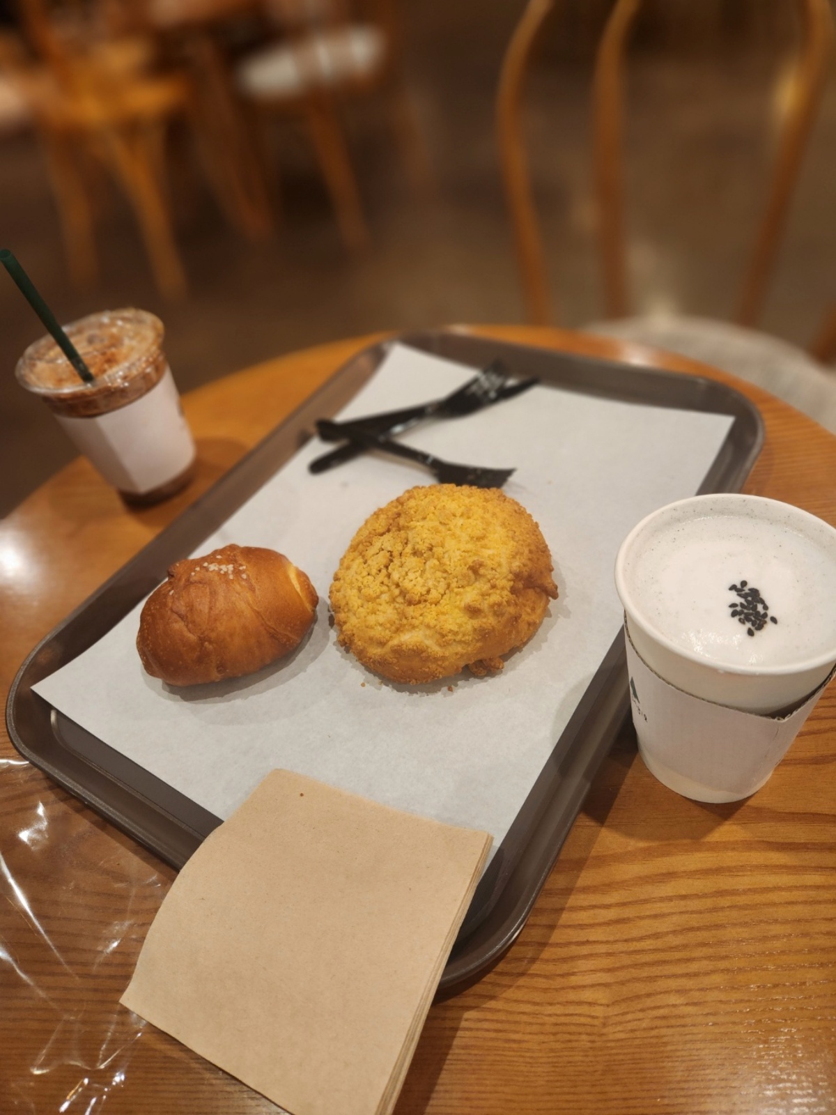 내가 갔을때에는 저녁이어서 그런지 빵의 종류가 많지 않았다. 사랑하는 소금빵과 추억의 소보르빵!! 그리고 오곡라떼와 커피를 시켰는데.. 일행과 내가 느낀 한가지... 달다..!!
