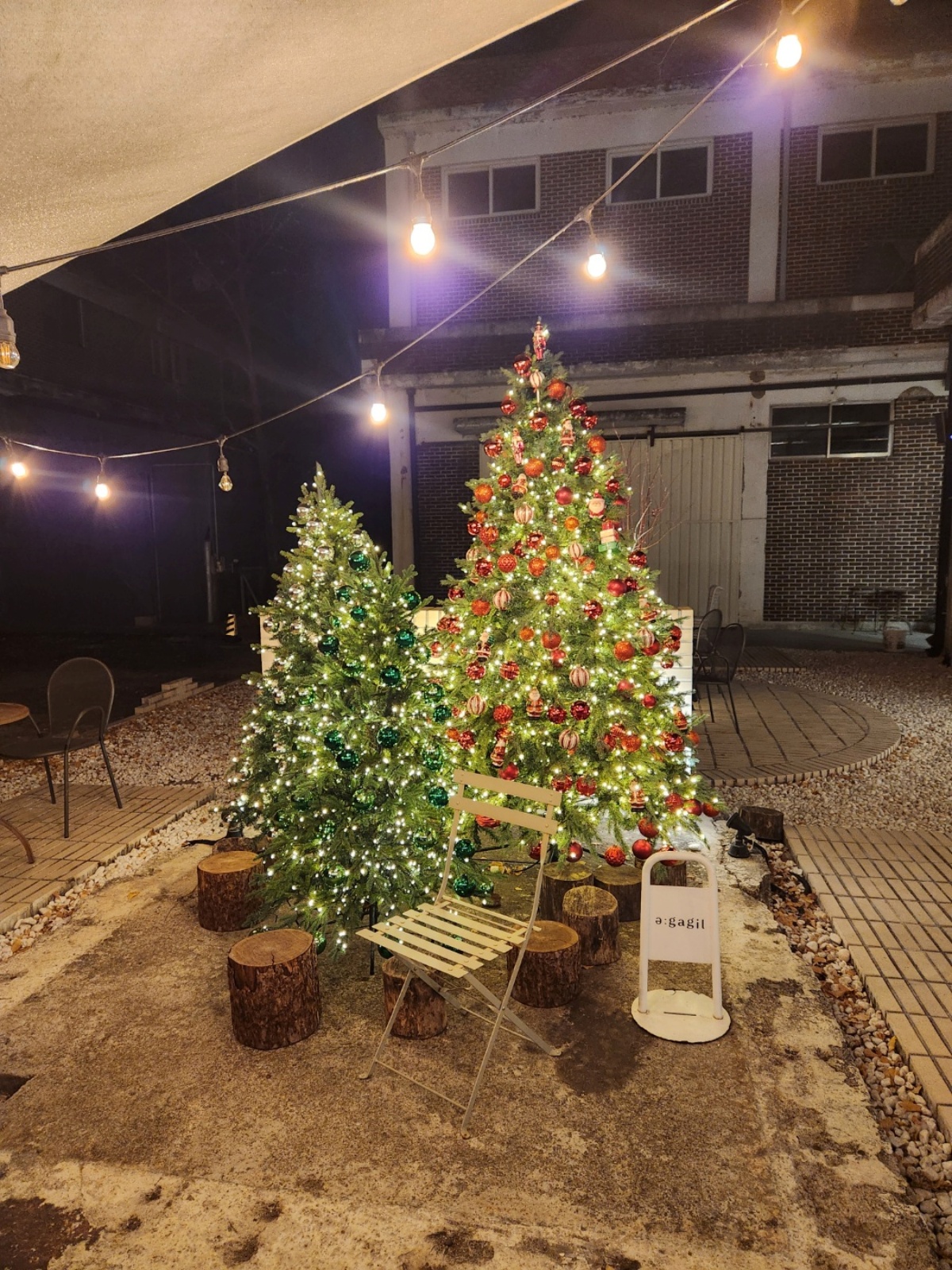 앞 조명과 너무나 매치가 잘 되어 있는 핫플이 될 수 밖에 없는 눈이 부신 트리를 영접하게 되었다. 저 앞 삼각대는 카페에서 설치해 주신듯!! 카페 사장님 센스가 있으셔요. ㅎㅎ
